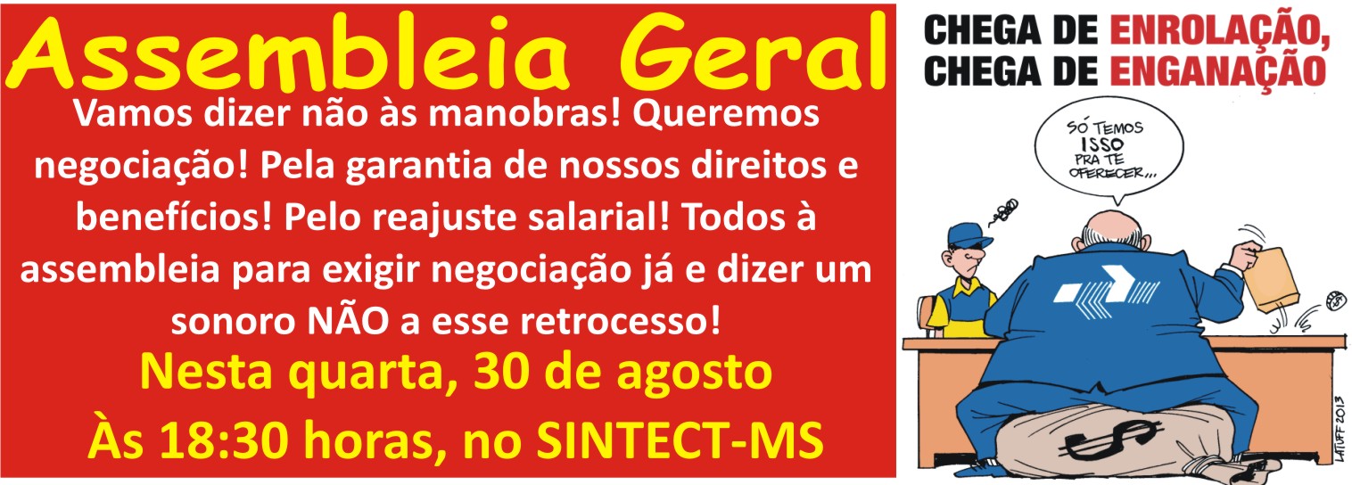 O SINTECT-MS convoca os trabalhadores para a Assembleia Geral que acontece nesta quarta, 30 de agosto, a partir das 18:30 horas, na sede do sindicato, e onde serão repassados os últimos informes das negociações do Acordo Coletivo. Também será discutido e votado a proposta de prorrogação do Acordo Coletivo de Trabalho até dezembro.