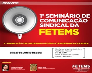 Seminário de Comunicação Sindical da Fetems Seminário comunicação sindical Convidamos todos para a abertura do 1º Seminário de Comunicação Sindical da FETEMS (Federação dos Trabalhadores em Educação do Mato Grosso do Sul) e para o lançamento do Livro "Latifúndio Midiota" do jornalista da CUT Nacional, Leonardo Severo. Dia: 26 de junho (Terça-feira) Horário: 14hs Local: Auditório da FETEMS - RUA 26 DE AGOSTO, 2296. Bairro: Amambaí Obs.: Convite em anexo. Qualquer dúvida ou mais informações: Entrar em contato pelo 9142-6522 ou 3382-0036 (Karina Vilas Boas - Assessora de Comunicação FETEMS).