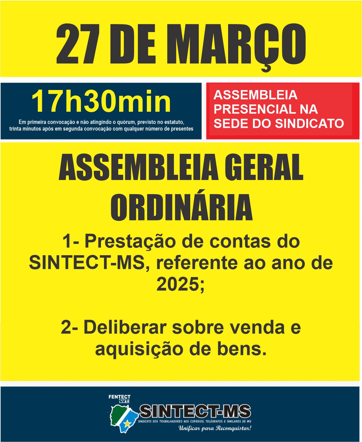 A Diretoria Executiva do SINTECT-MS, no uso de suas atribuições estatutárias, convoca pelo presente edital, todos os trabalhadores da Empresa Brasileira de Correios e Telégrafos em Mato Grosso do Sul, filiados ao SINTECT-MS, a comparecerem na Assembleia Geral Ordinária na sede própria da entidade, sito a Rua General Sampaio, 180, Bairro Cabreúva, nesta capital, no dia 27 de março de 2026, às 17hs30min, em primeira convocação e não atingindo quorum, previsto no estatuto, trinta minutos após em segunda convocação com qualquer número de presentes para deliberar e apreciar sobre a seguinte pauta: 1- Prestação de contas do SINTECT-MS, referente ao ano de 2025; 2- Deliberar sobre venda e aquisição de bens. Ficam então convocados todos os sindicalizados para comparecerem à Assembleia.