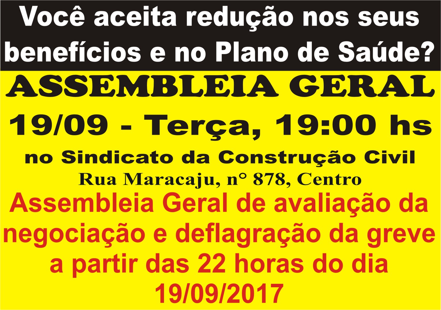A Assembleia será realizada no Sindicato da Construção Civil, situado na Rua Maracaju, n° 878, Bairro Centro, na capital, em primeira convocação às 19h00h, e não atingindo o quórum previsto no Estatuto, trinta minutos após em segunda chamada com qualquer número de presentes.