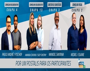 Conheça os nossos candidatos ao Conselho Deliberativo do Postalis e as propostas conjuntas da Chapa 04 - Paulo André e Fischer - e da Chapa 13 - Amanda Corcino e Suzy Cristiny.