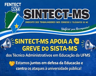 O Sindicato dos Trabalhadores nos Correios e Telégrafos de Mato Grosso do Sul (SINTECT-MS) manifesta seu total apoio à greve deflagrada pelo SISTA-MS, representando os Técnicos Administrativos em Educação da Universidade Federal de Mato Grosso do Sul (UFMS).