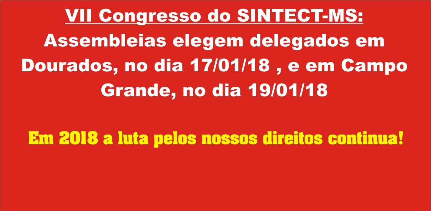 Dourados – Assembleia dia 17/01, as 18hs, na sub-sede do SINTECT (rua Clóvis Bevilaquia, nº 180), para eleger 3 delegados(as).