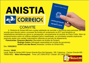 A Diretoria do Sintect-MS tem a grata satisfação de convidar o Senhor(a) para participar de reunião para discutir sobre o processo de Anistia em andamento na ECT que beneficia os trabalhadores demitidos por greve ou perseguição, principalmente do período do Plano Collor. Além de esclarecimentos sobre os critérios adotados para a readmissão, os convidados estarão explicando possíveis ações com caráter indenizatório referente ao período de afastamento.