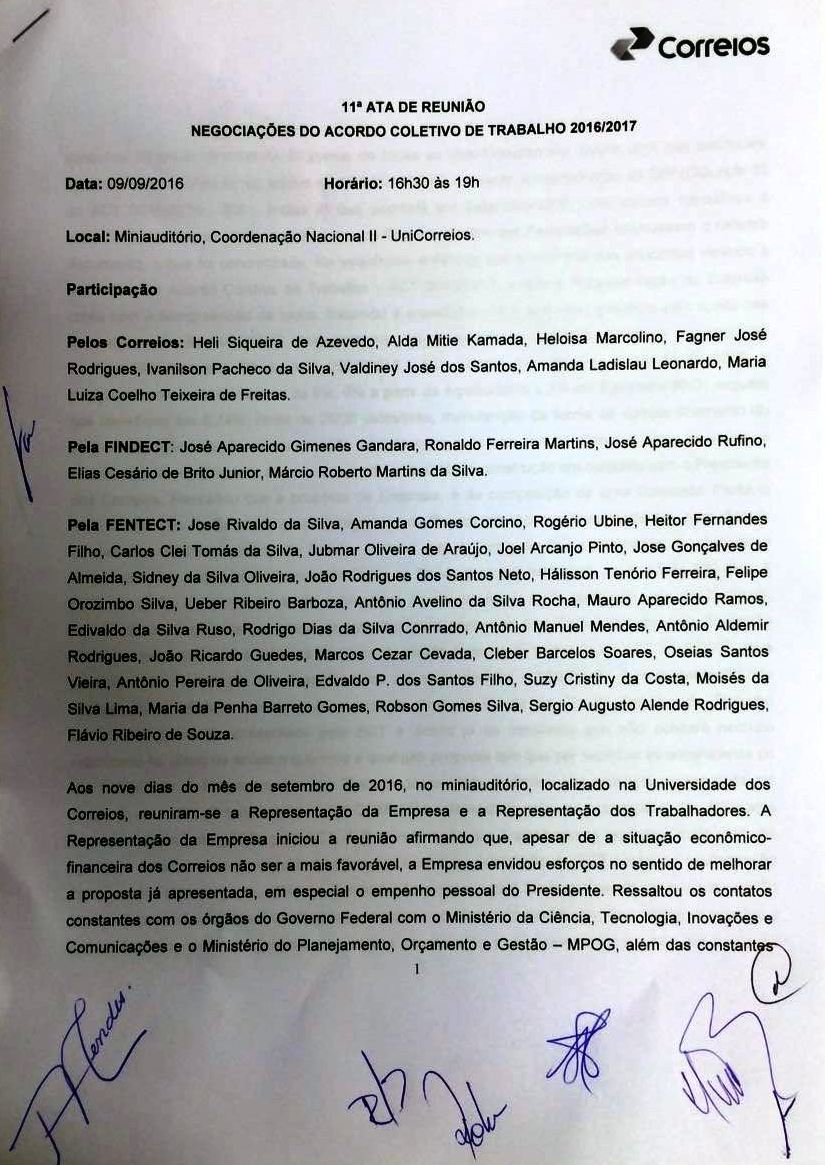 Publicamos em anexo, no formato PDF, a 11ª Ata da Negociação do Acordo Coletivo de Trabalho 2016/2017. (Clicar lá em baixo, ao final do texto, em ATA 090902016. ao em Arquivos Relacionados para Baixar para visualizar a Ata na íntegra).