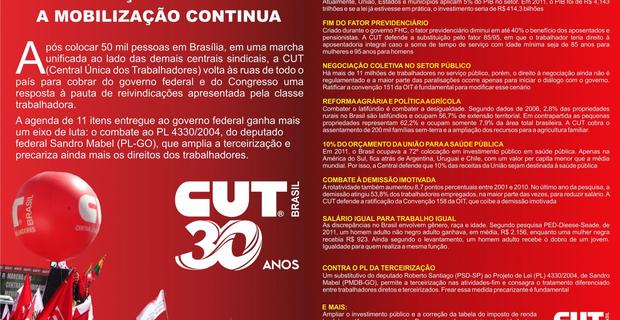 Após colocar 50 mil pessoas em Brasília, em uma marcha unificada ao lado das demais centrais sindicais, a CUT (Central Única dos Trabalhadores) volta às ruas de todo o país para cobrar do governo federal e do Congresso uma resposta à pauta de reivindicações apresentada pela classe trabalhadora.