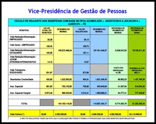 Nesta terça-feira, dia 26 de agosto, a ECT apresentou a Proposta de Reajuste para os Benefícios do ACT/2014. Durante a reunião, na Universidade dos Correios, a direção da empresa apresentou o índice de 6.502315% nos benefícios vale-refeição/alimentação e vale-cesta, do empregado; vale-refeição/alimentação, do estagiário; vale-refeição/alimentação, do jovem aprendiz, apenados, PCD; vale-transporte-rodoviário; reembolso creche/babá, auxílio especial e o auxílio especial integral.