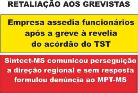 O Sintect-MS oficializou a irregularidade a diretoria regional por prática anti-sindical e assédio moral, todavia, não recebeu nenhuma resposta positiva sobre o alerta emitido pela nossa entidade. Em razão disso, protocolizou denúncia no Ministério Público do Trabalho cobrando medidas contra as retaliações da ECT que violam o direito de greve. Os trabalhadores que estão passando por essa situação entrem em contato com o SINTECT-MS, via telefone 3042-8752 ou por e-mail sintectms@sintectms.org.br, para o ingresso das medidas cabíveis.