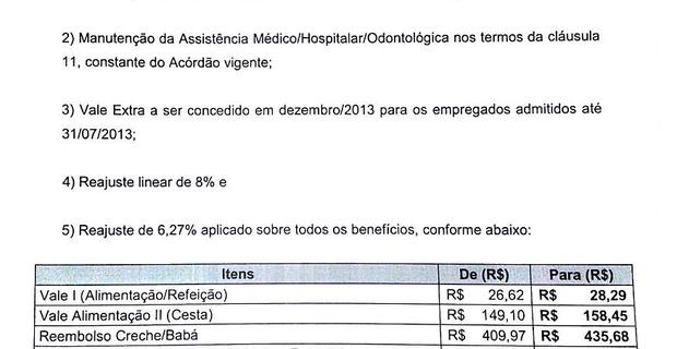 Na Reunião de negociações da Campanha Salarial 2013 realizada nesta quinta-feira (13) na Universidade dos Correios (Unico), a Empresa apresentou uma nova proposta econômica. A ECT propõe o reajuste de apenas 8,00% (menos de 1% de aumento real com relação a nossa reivindicação) aplicado sobre os salários. E reajuste de 6,27% sobre os benefícios conforme abaixo: