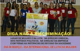 A nós mulheres que trabalhamos muito, somos eficientes, possuímos melhor escolaridade, cumprimos jornada tripla de trabalho, ocupamos menos cargo de chefia, somos em menor quantidade nas direções sindicais, partidos políticos e nos espaços de representação parlamentar, judiciário e no executivo, ganhamos menos, mesmo assim, superando barreiras, encontramos forças para lutar contra discriminação, amar, ser mãe e lutar pela transformação. Lugar da mulher é no sindicato, nos partidos, em todos os espaços de decisão.