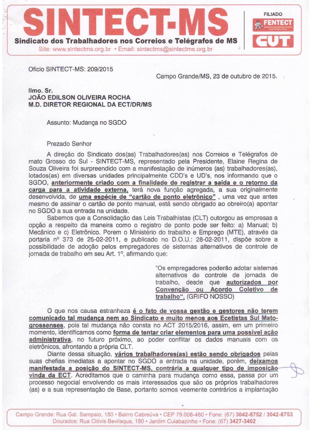 “A direção do Sindicato dos (as) Trabalhadores (as) nos Correios e Telégrafos de mato Grosso do Sul - SINTECT-MS, representado pela Presidente, Elaine Regina de Souza Oliveira foi surpreendido com a manifestação de inúmeros (as) trabalhadores(as), lotados(as) em diversas unidades principalmente CDD’s e UD’s, nos informando que o SGDO, anteriormente criado com a finalidade de registrar a saída e o retorno da carga para a atividade externa, terá nova função agregada, a sua originalmente desenvolvida, de uma espécie de “cartão de ponto eletrônico” , uma vez que antes mesmo de assinar o cartão de ponto manual, está sendo obrigado ao obreiro(a) apontar no SGDO a sua entrada na unidade.