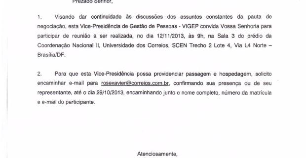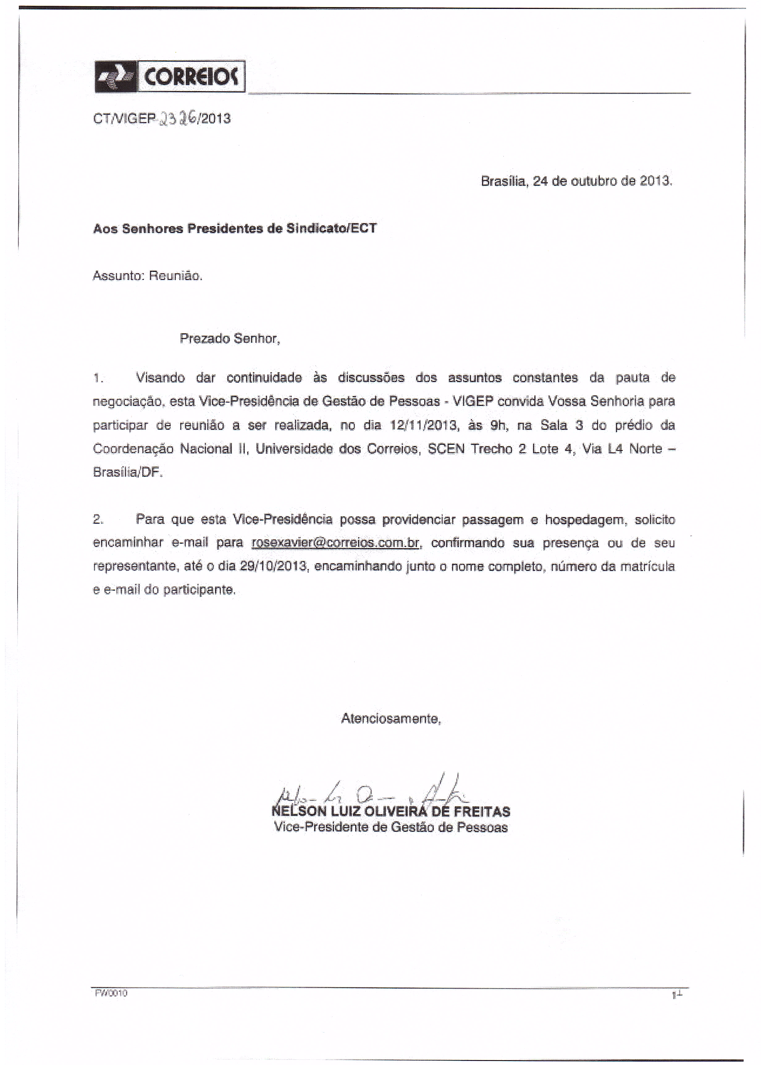 Novo Vice-Presidente de Gestão de Pessoas, Nelson Luiz Oliveira de Freitas convida os Presidente e Secretario Geral dos sindicatos a participarem de uma reunião a ser realizada, no dia 12/11/2013, às 9h, em Brasília-DF. Quanto à pauta da reunião o SINTECT-MS já solicitou mais informações. Ratificamos nosso interesse em continuar viabilizando avanços nas relações de trabalho, saúde do trabalhador e um debate profícuo da cadeia produtiva da ECT.