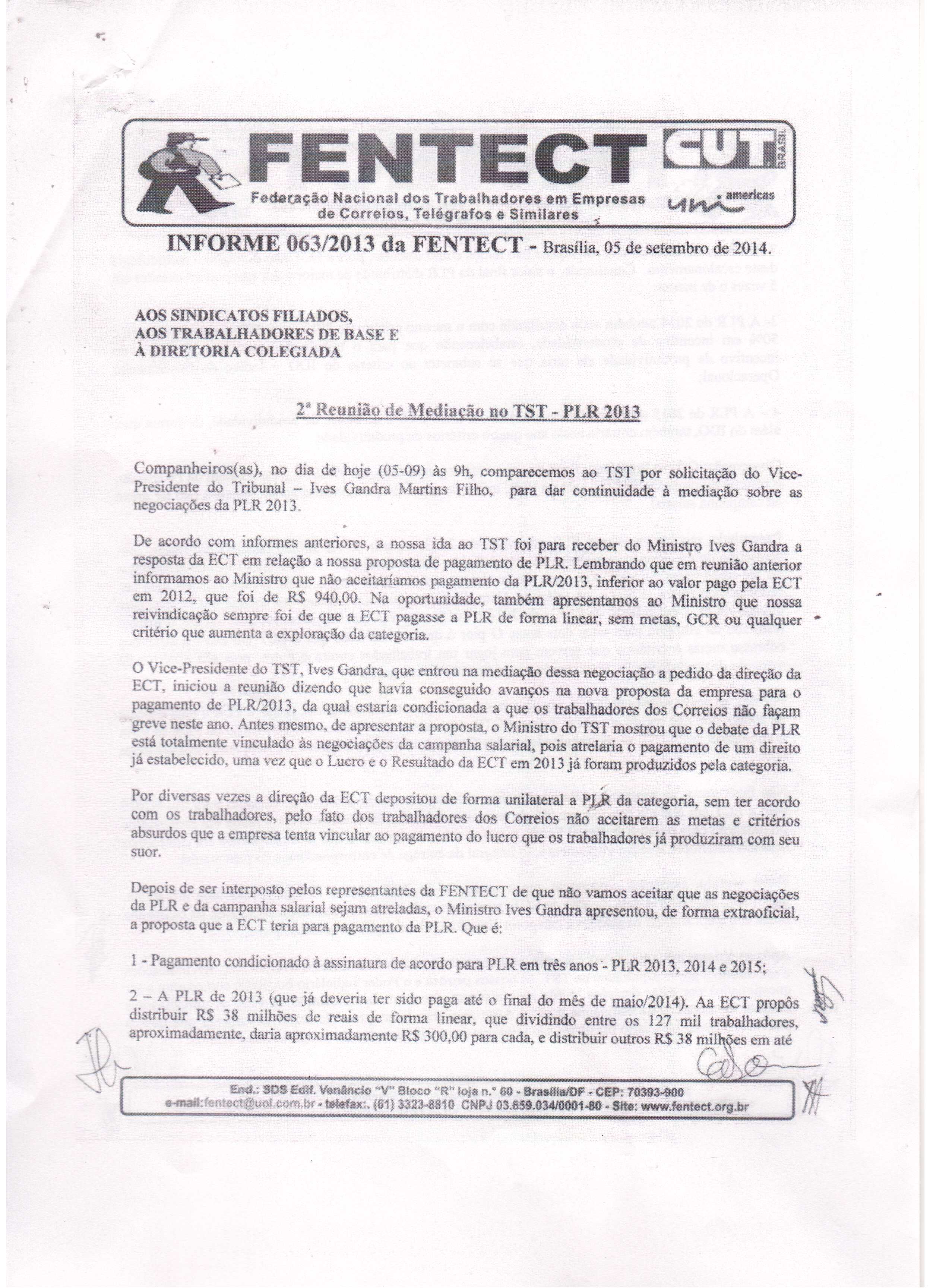 O Superior Tribunal de Trabalho (TST) intermediou mais uma reunião neste dia 5 de setembro (quinta-feira), às 9 horas, para apresentar as ponderações feitas pela ECT depois que o ministro levou a proposta que foi formatada com a FENTECT da Participação nos Lucros e Resultados (PLR).