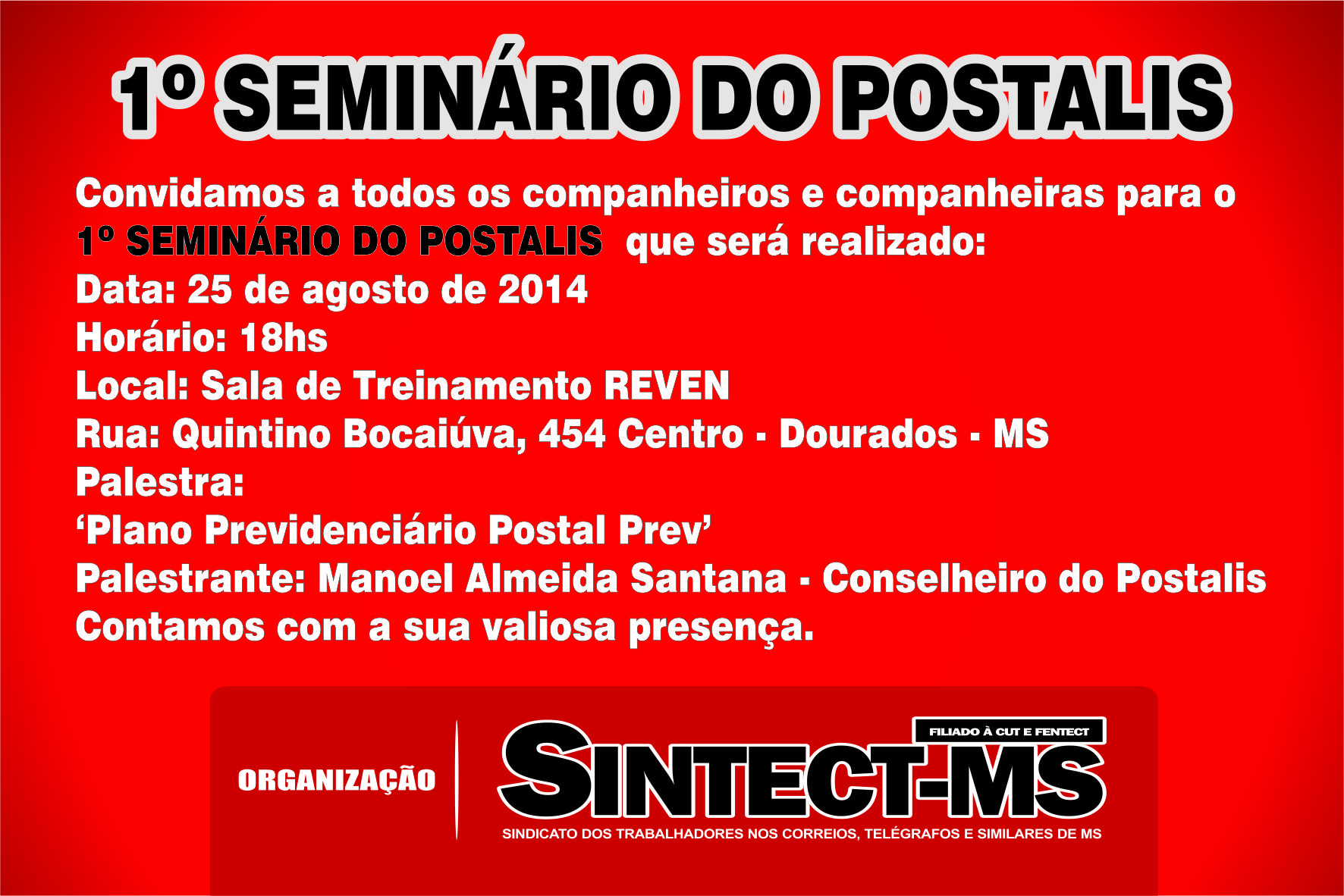 O SINTECT-MS realizará o 1º SEMINÁRIO DO POSTALIS, o evento acontecerá nas cidades de Campo Grande e Dourados, com a presença do Conselheiro Manoel Almeida Santana.