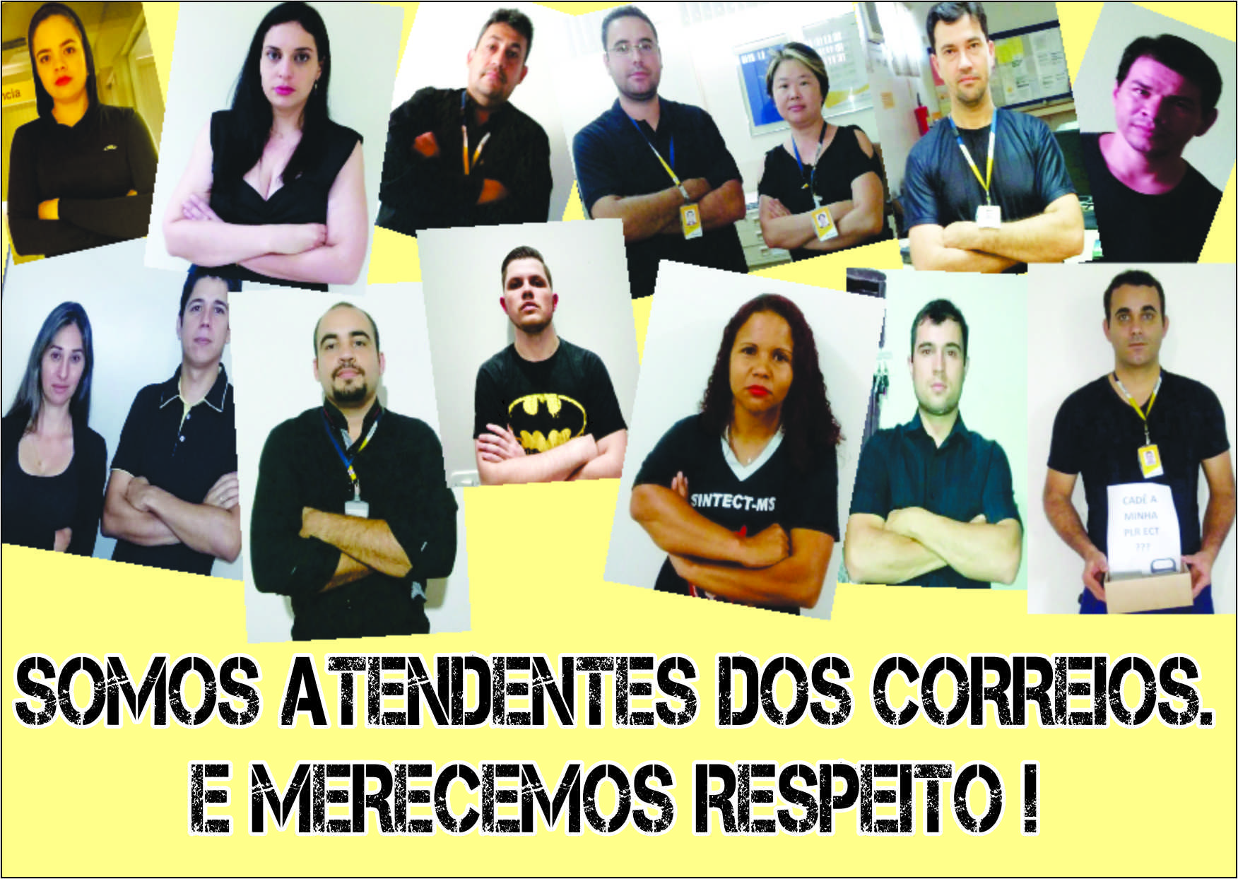 Por conta de todos os problemas vividos encampamos uma campanha na semana do dia do (a) Atendente, e esta campanha ainda não encerrou, desta forma solicitamos aos Atendentes Comerciais que ainda não enviaram que nos envie uma foto vestindo uma camiseta preta, ou com seu uniforme com uma tarja preta no braço, para que o SINTECT-MS produza um lindo cartão postal com a imagem dos nossos atendentes, demonstrando toda insatisfação devido à forma com que os Correios vem nos tratando, e assim posteriormente será confeccionado este cartão postal e cada atendente receberá o seu para preenchimento, e fazermos um grande ato enviando este cartão ao Presidente dos Correios.
