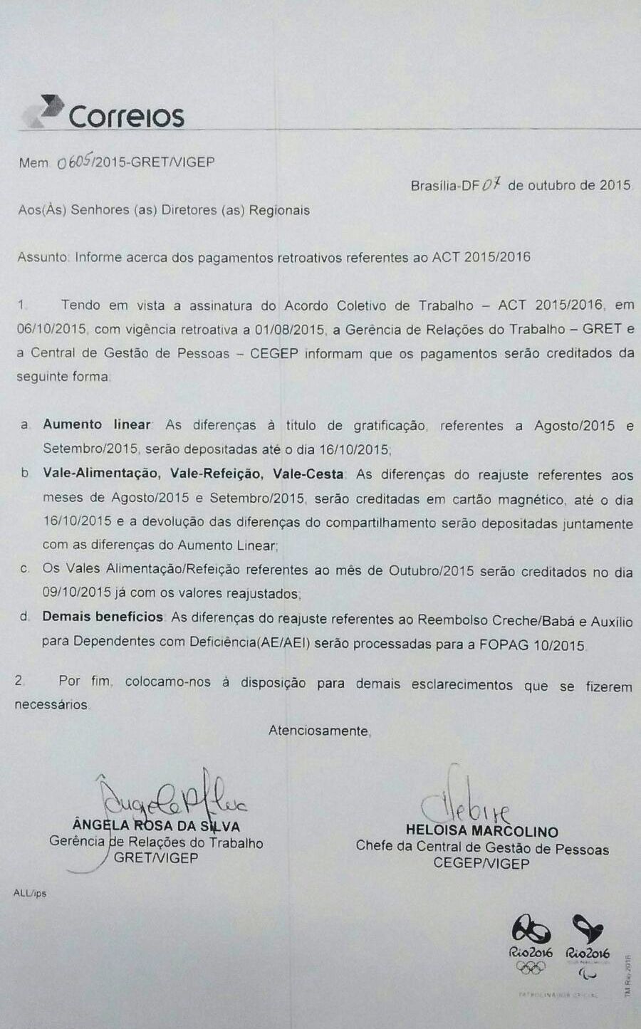 Segue Abaixo memorando com datas do pagamento dos valores retroativos e Acordo Coletivo de Trabalho 2015/2016.