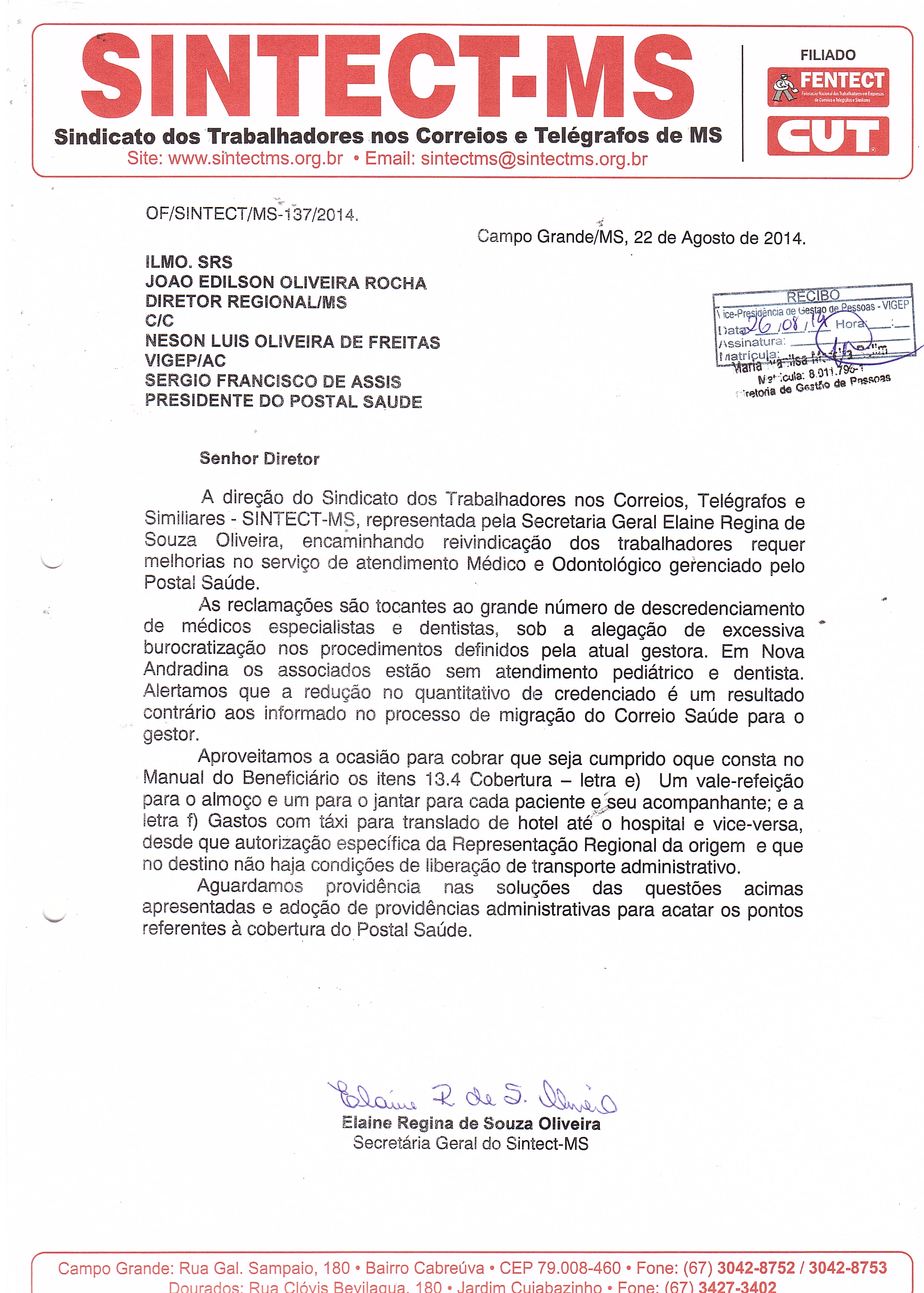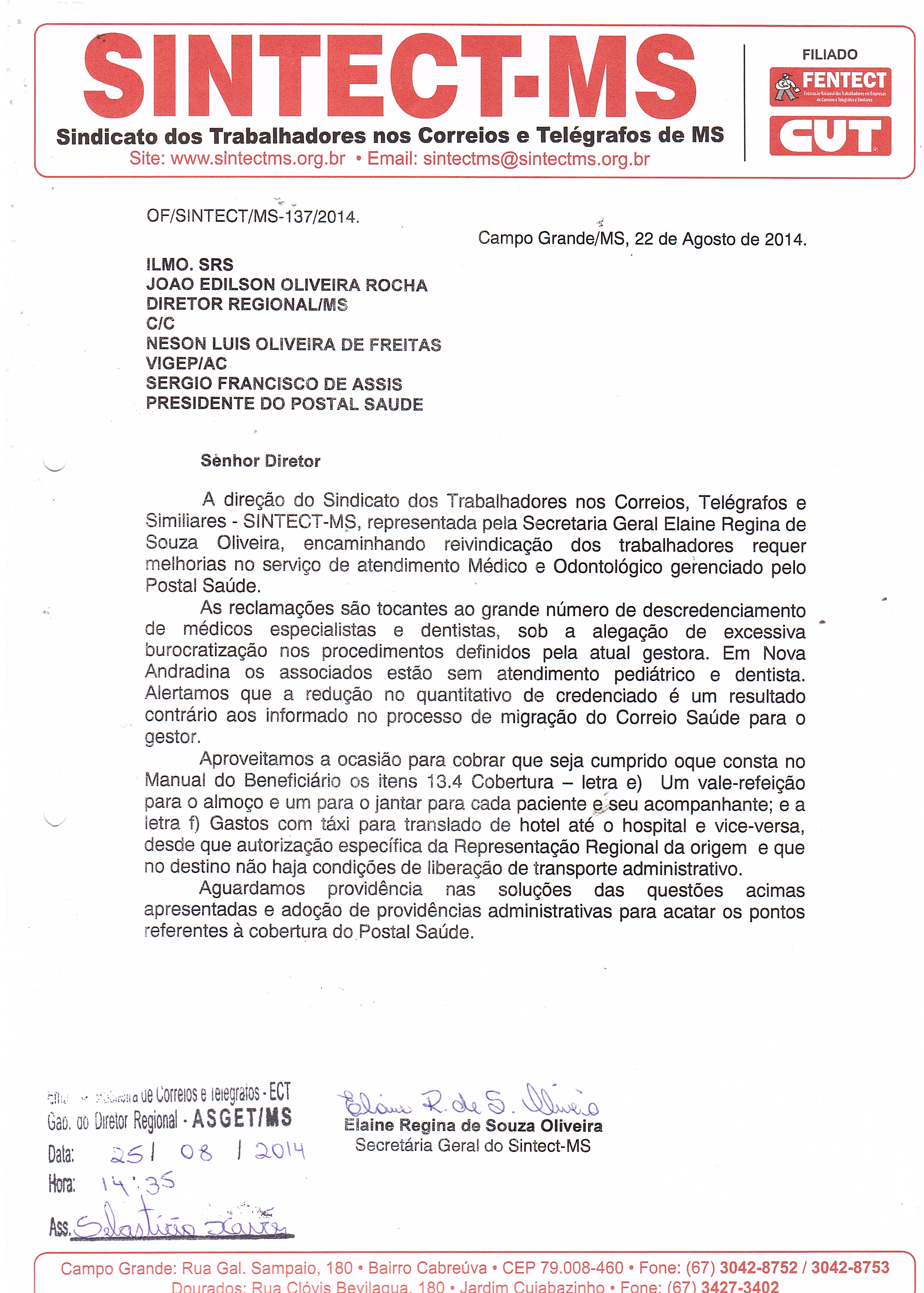 O atendimento do Postal Saúde foi uma das principais reclamações da categoria nas visitas setoriais realizadas em Campo Grande e nos municípios visitados. A direção do Sintect-MS já protocolizou ofício solicitando o credenciamento de mais médicos especialista e do retardamento causado na demora das perícias odontológicas, além do descredenciamento de vários dentistas por exigências em demasia de além da radiografias também foto da boca do paciente.